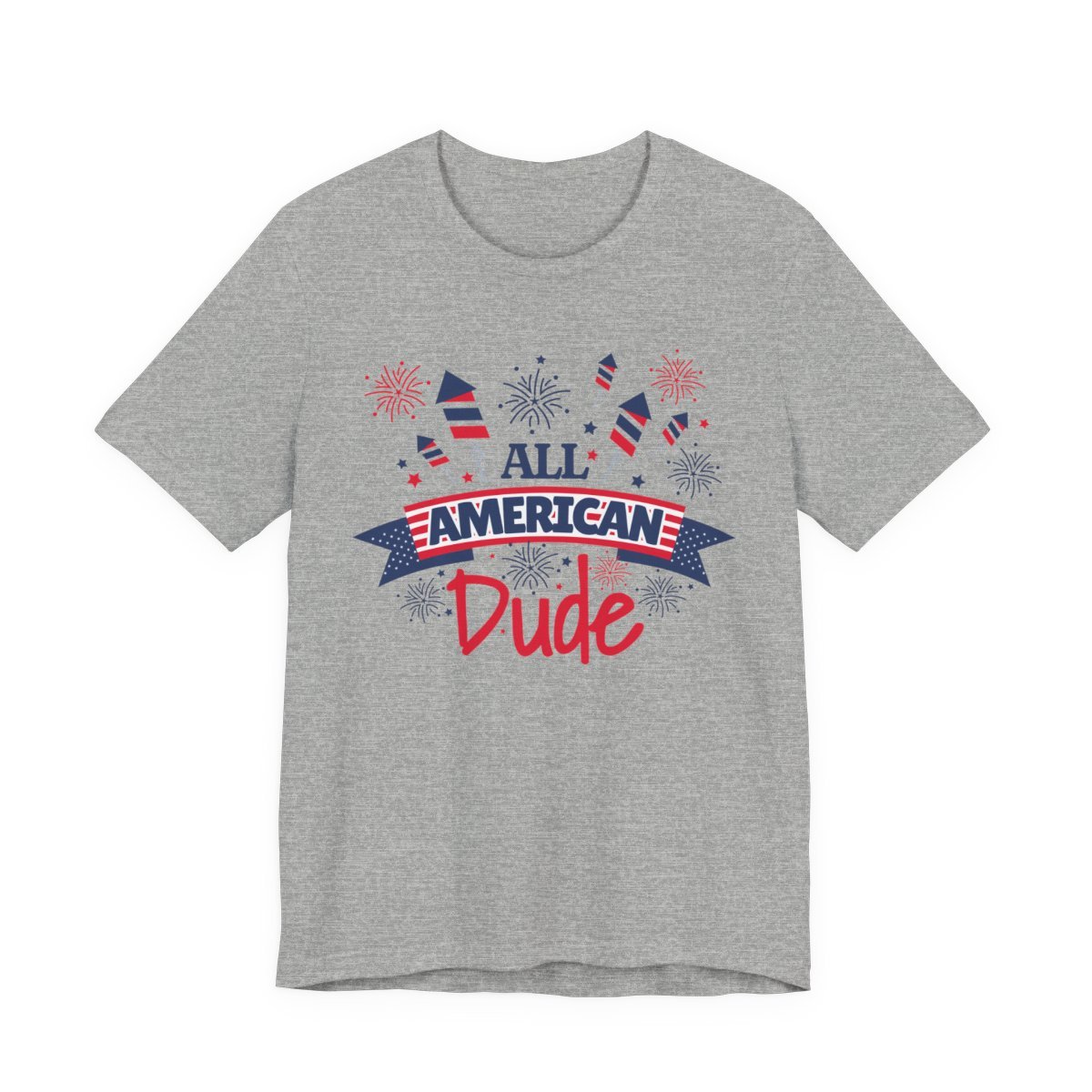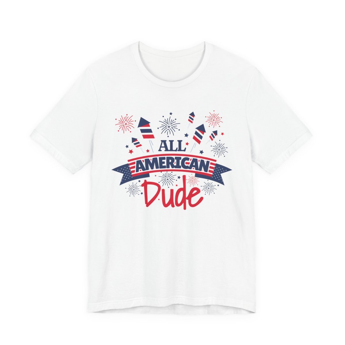 Lightweight, breathable, and built for relaxed summer days — this classic crew tee carries a playful patriotic print that reads “All American Dude.” The Bella Canvas 3001 fabric feels soft against the skin thanks to 100% Airlume combed and ring-spun cotton (blends for heathers), with side seams and shoulder tape to keep the shape wash after wash. The ribbed knit collar and retail fit create a tidy silhouette that layers easily over board shorts or under a denim jacket. Printed with crisp, detailed DTF/DTG methods, the artwork’s fireworks and banner pop in red and navy without feeling heavy or stiff. Tear-away label adds comfort, and responsibly manufactured construction gives this shirt a cleaner conscience for everyday wear.