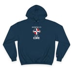 This warm, midweight Champion hoodie carries quiet pride without shouting. A navy pullover framed by a clean, centered graphic — hands peeling open a chest to reveal the Dominican flag with the words “DOMINICAN AT MY CORE” — it settles into your rotation as a comfortable statement piece. The two-ply hood and adjustable drawstrings lock in warmth on blustery mornings. The roomy kangaroo pocket keeps hands warm and holds your essentials while the regular, laid-back fit drapes naturally over layers. Built from a 50/50 cotton–poly blend with tubular knit construction, it resists shrinking and holds prints well, and small eco-conscious details (a portion of recycled fibers) make it feel thoughtful to wear. Finished with the signature Champion “C” on the sleeve, this hoodie blends everyday comfort with a personal connection to heritage.