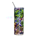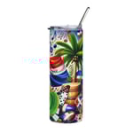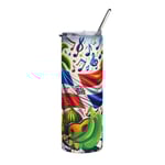 This 20 oz stainless steel tumbler brings island rhythm to every sip. Wrapped in a vibrant, full-wrap print of tropical palms, ripe fruit, musical notes and fluttering flags, it carries the energy of beachside gatherings and backyard fiestas. Lightweight and slim, it slips into cup holders and commuter bags while keeping drinks protected by a clear lid and reusable straw. The glossy varnish over the artwork gives colors extra depth and makes the design pop, while the durable stainless-steel body stands up to daily use. Use it at outdoor parties, weekend drives, or whenever you want a burst of sunshine with your drink.