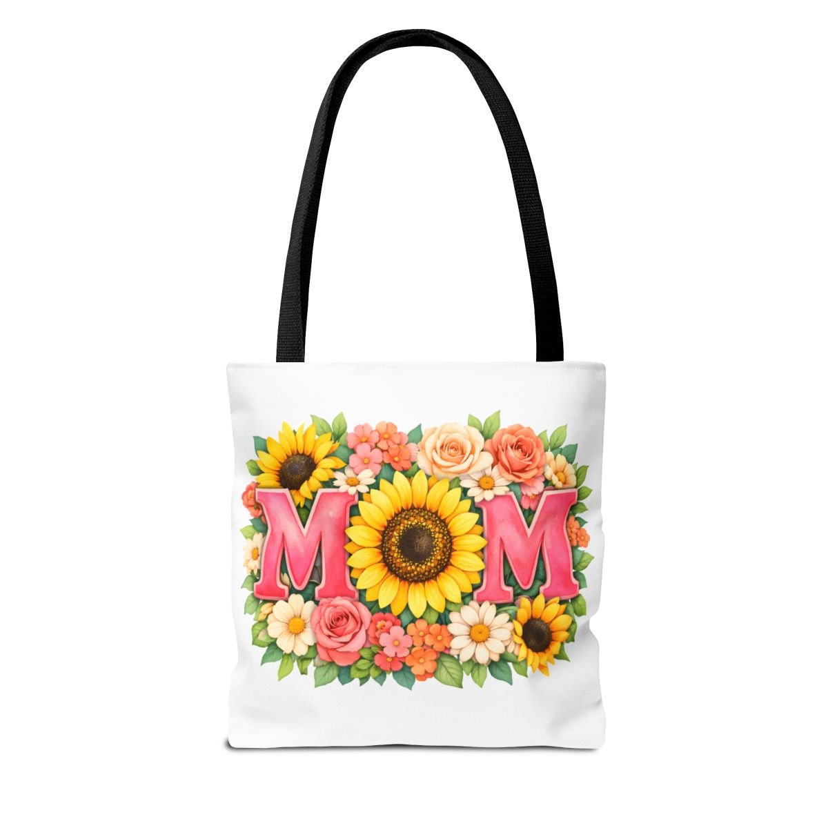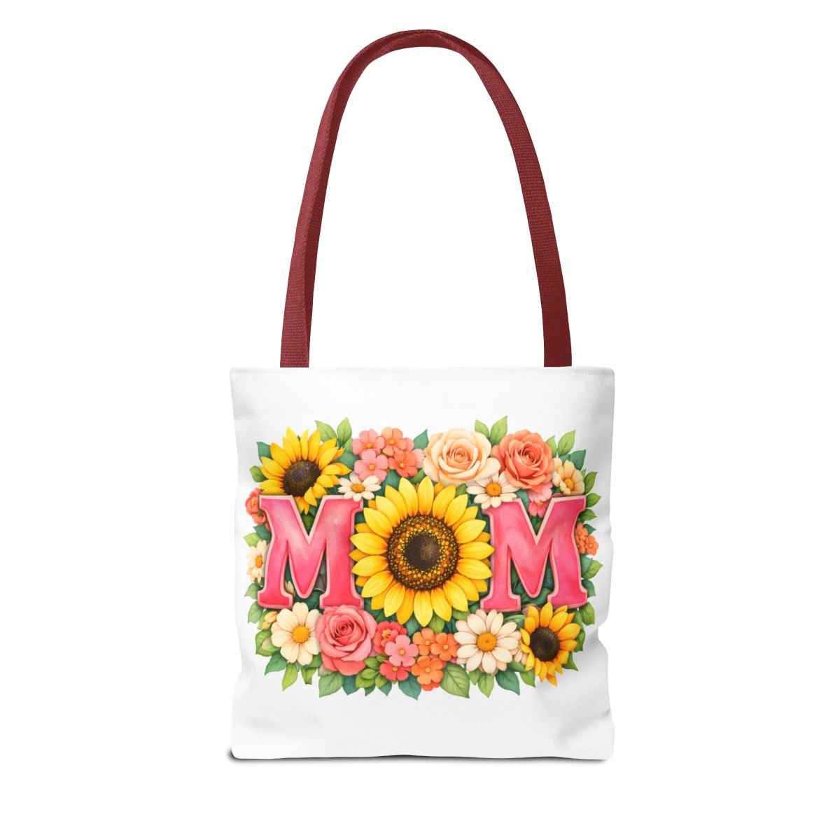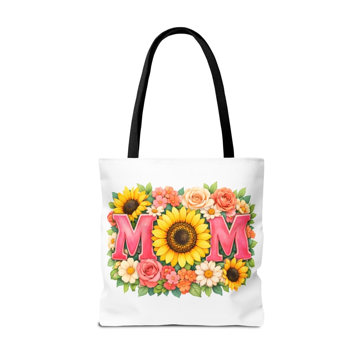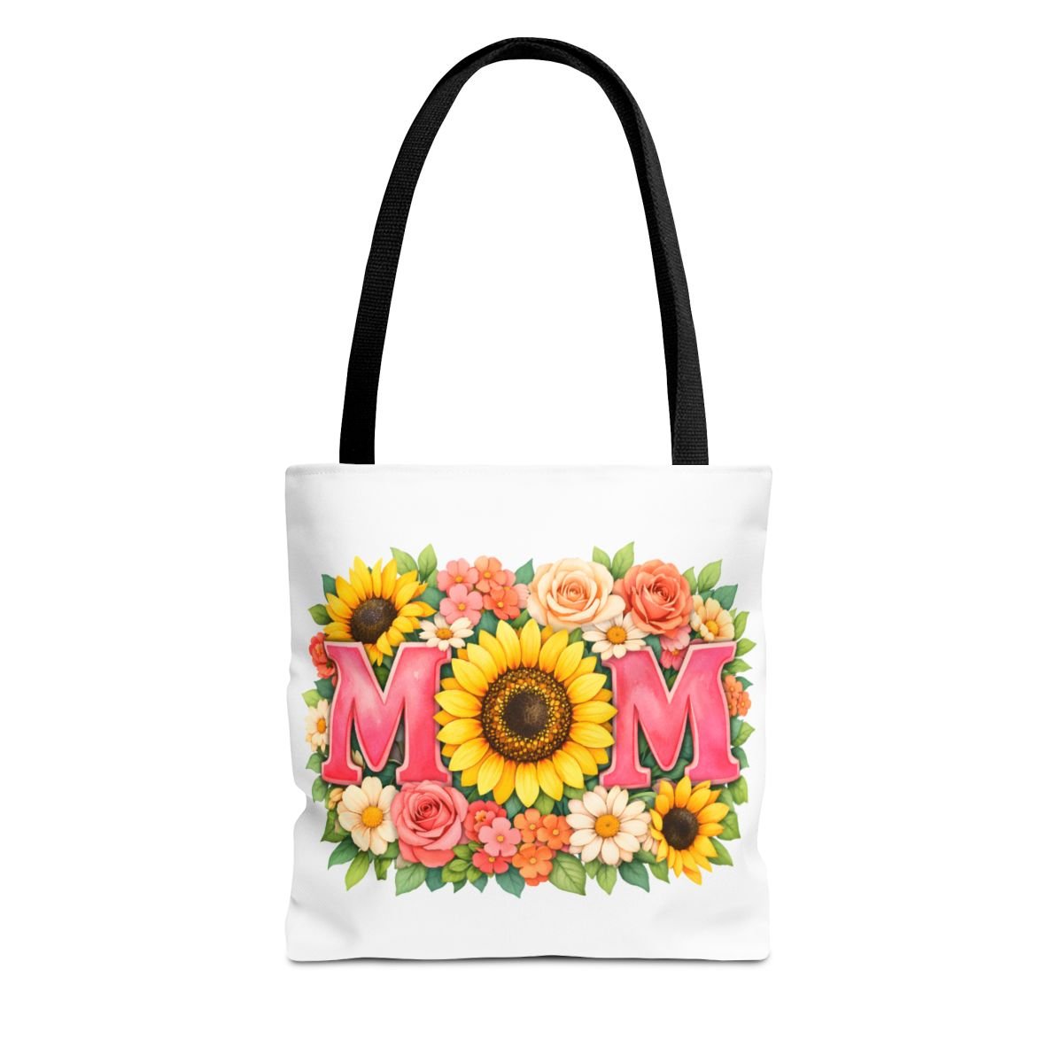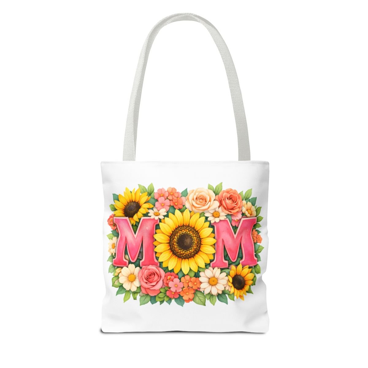 Bright, cheerful tote with a sunlit floral design centered around the word “MOM.” The front showcases a bold sunflower at the heart of the composition, framed by roses, daisies, and leafy greenery in warm coral, pink and yellow tones. Lightweight yet sturdy polyester holds the print’s vibrant colors while boxed corners and reinforced handle stitching keep the bag roomy and reliable for everyday errands, farmer’s markets, or weekend outings. Choose from five handle colors to match your style or mood. It carries memories and everyday essentials with a soft, summery feel — like a pocket of garden sunshine you can take along wherever you go.