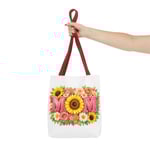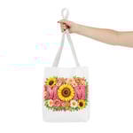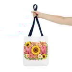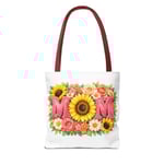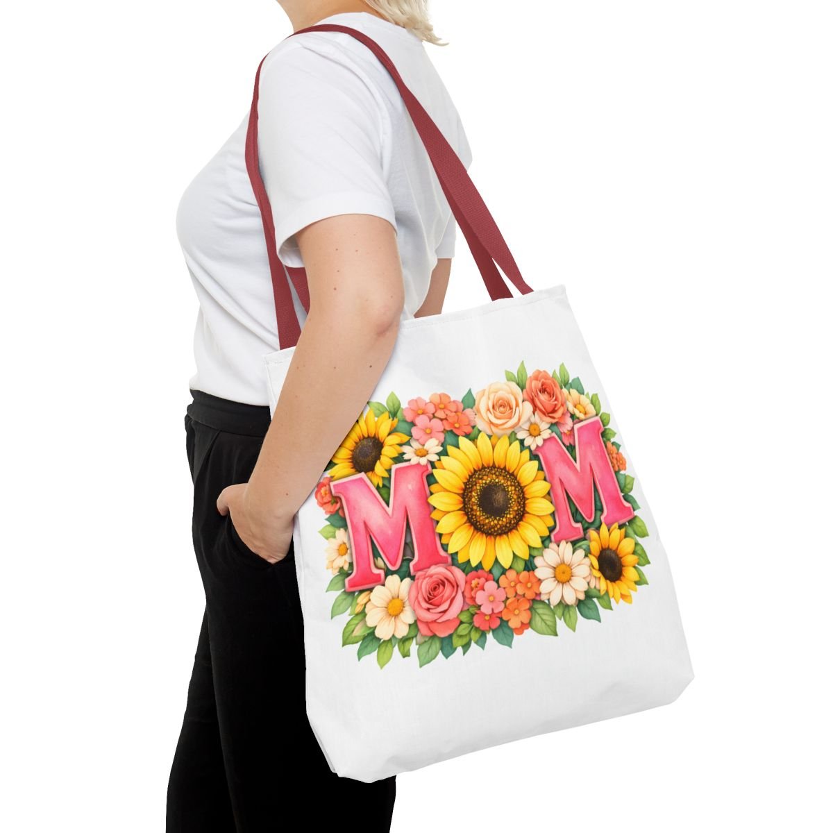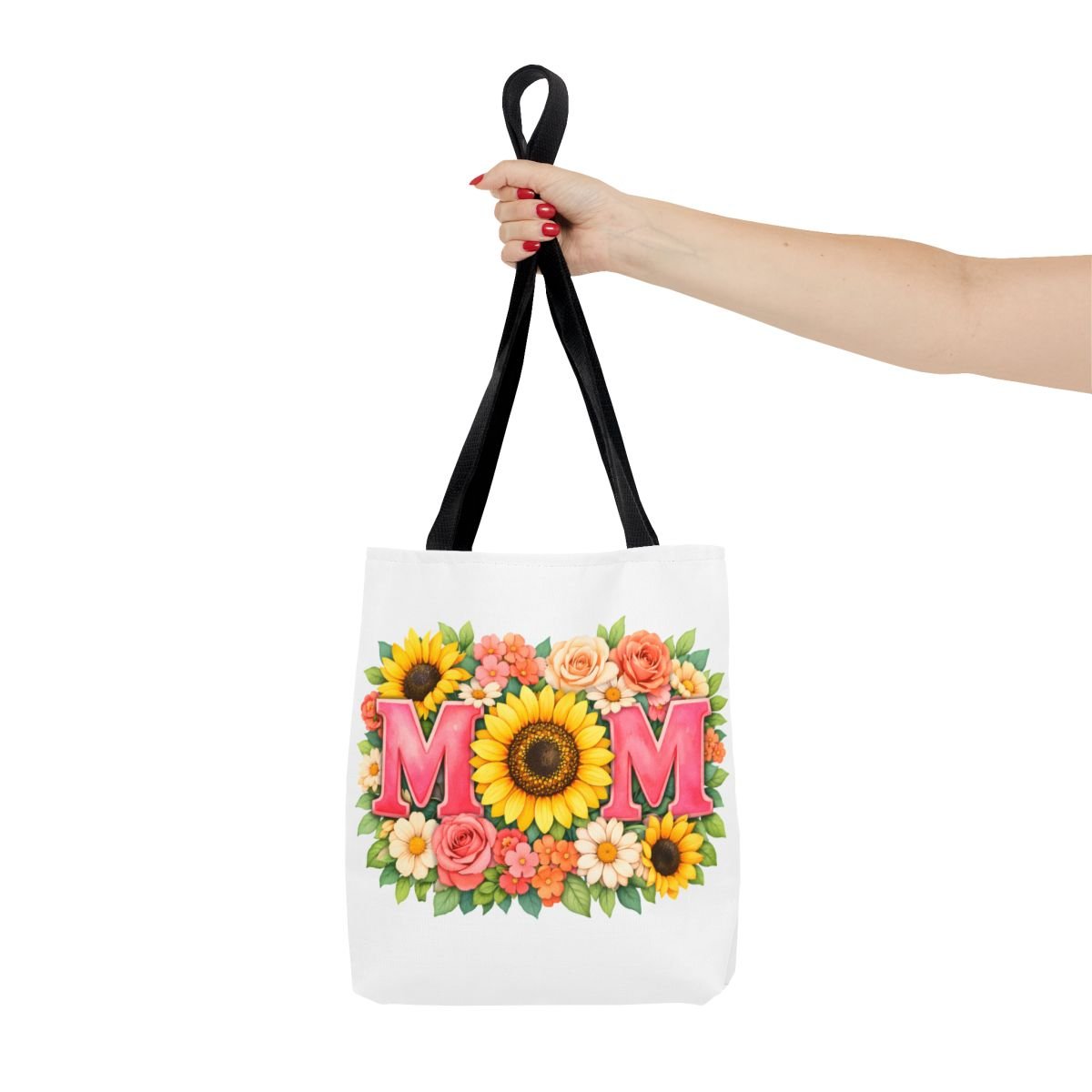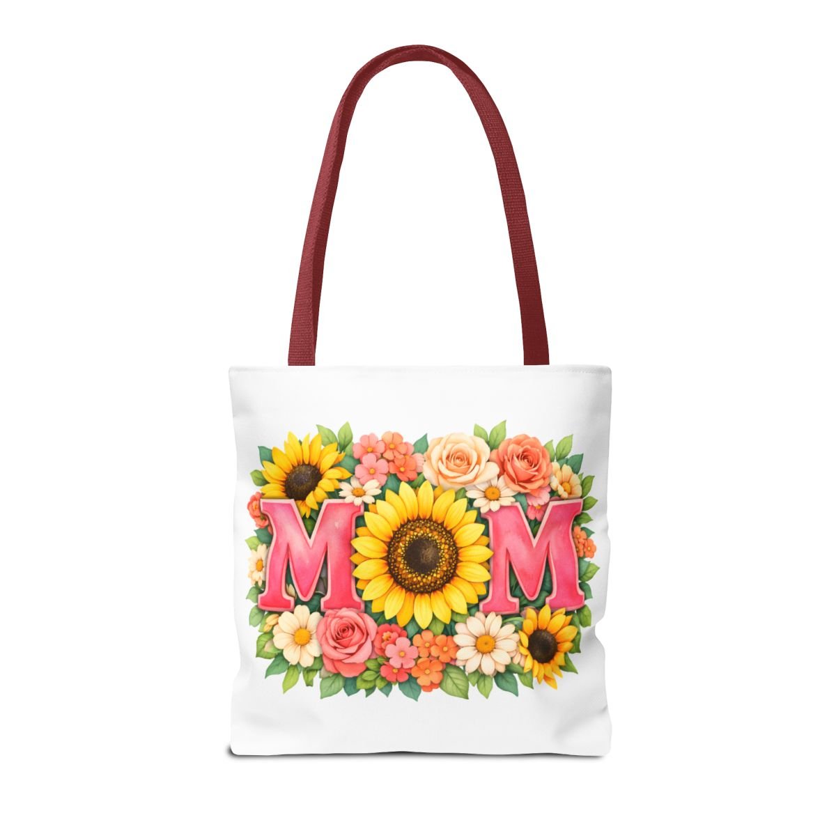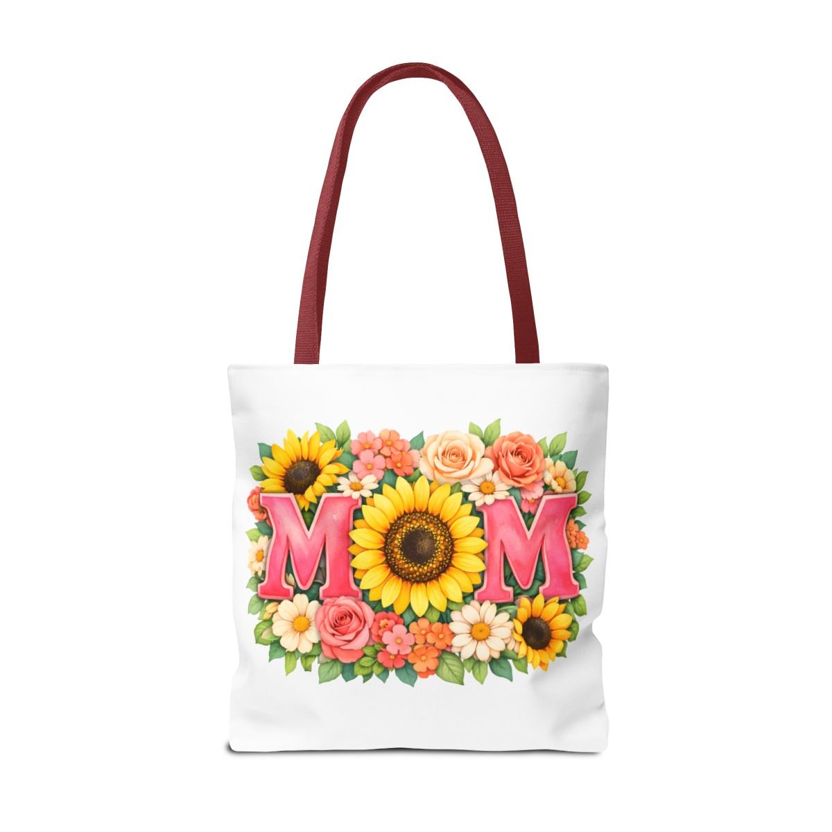 Bright, cheerful tote with a sunlit floral design centered around the word “MOM.” The front showcases a bold sunflower at the heart of the composition, framed by roses, daisies, and leafy greenery in warm coral, pink and yellow tones. Lightweight yet sturdy polyester holds the print’s vibrant colors while boxed corners and reinforced handle stitching keep the bag roomy and reliable for everyday errands, farmer’s markets, or weekend outings. Choose from five handle colors to match your style or mood. It carries memories and everyday essentials with a soft, summery feel — like a pocket of garden sunshine you can take along wherever you go.