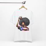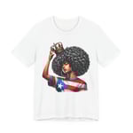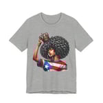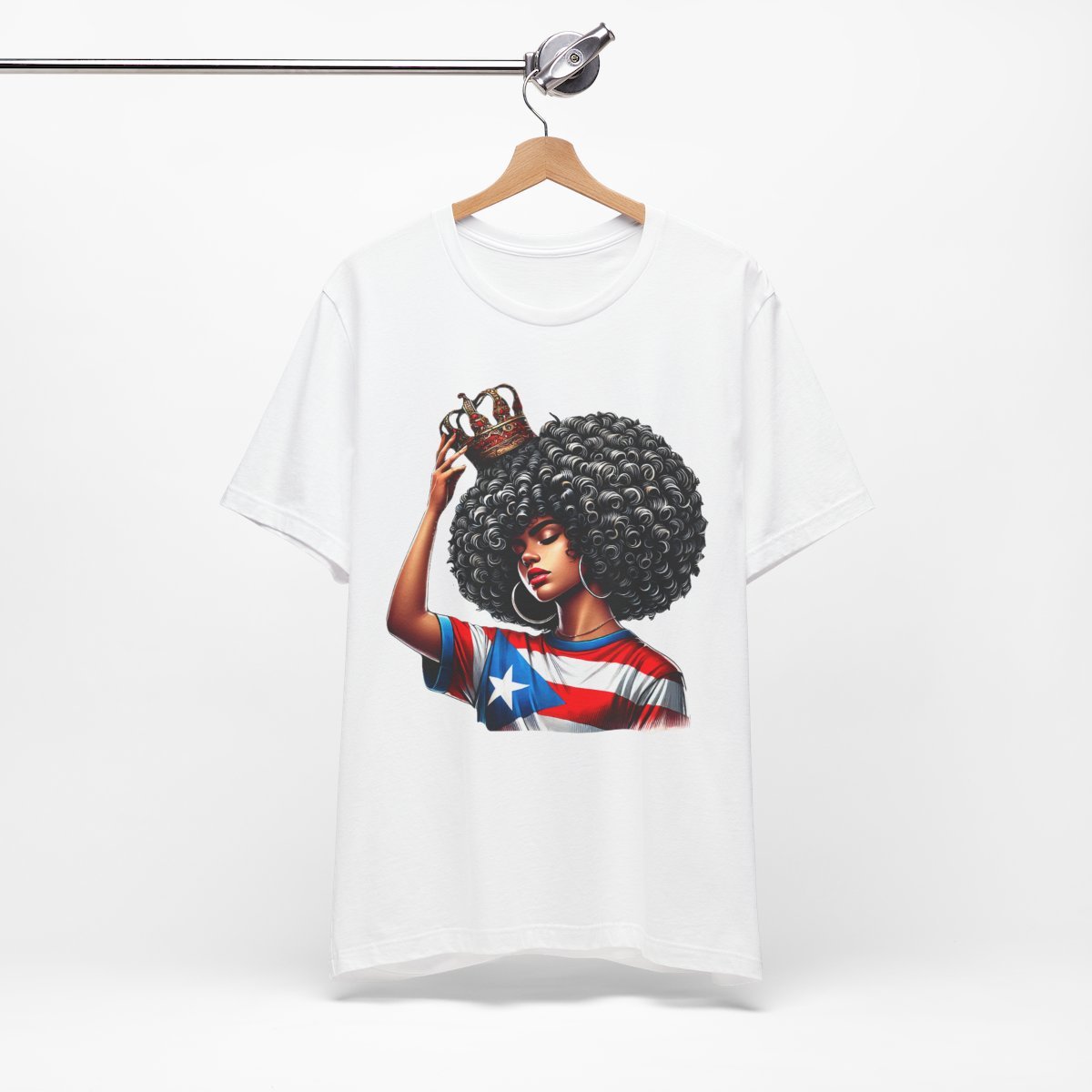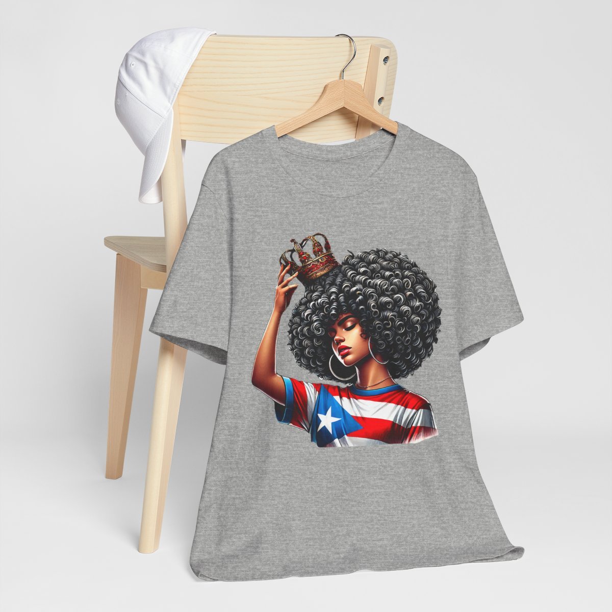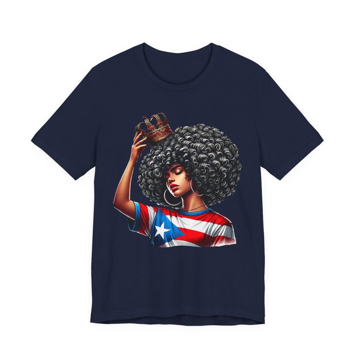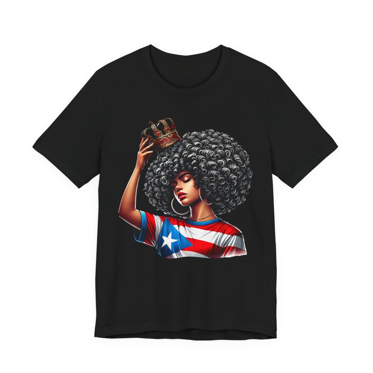 This lightweight crewneck tee carries quiet confidence. The front print shows a woman with a bold afro, a crown held above her head, and a Puerto Rican flag motif woven into her top—an image that reads like a personal anthem. The soft, breathable Airlume combed cotton feels gentle against skin and layers easily under jackets or over long-sleeve shirts. Clean side seams and a ribbed knit collar keep the silhouette crisp after repeated wear. Wear it to community gatherings, cultural festivals, or lazy weekends when you want your outfit to speak with dignity rather than noise. The tear-away label and stable shoulder tape make it comfortable for all-day wear, while thoughtful printing methods preserve the artwork’s fine detail and vibrant tones.
