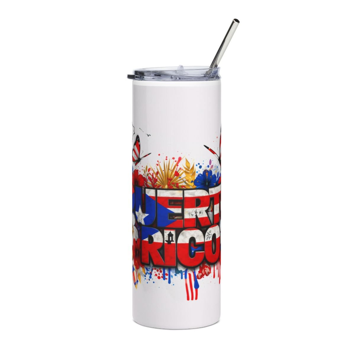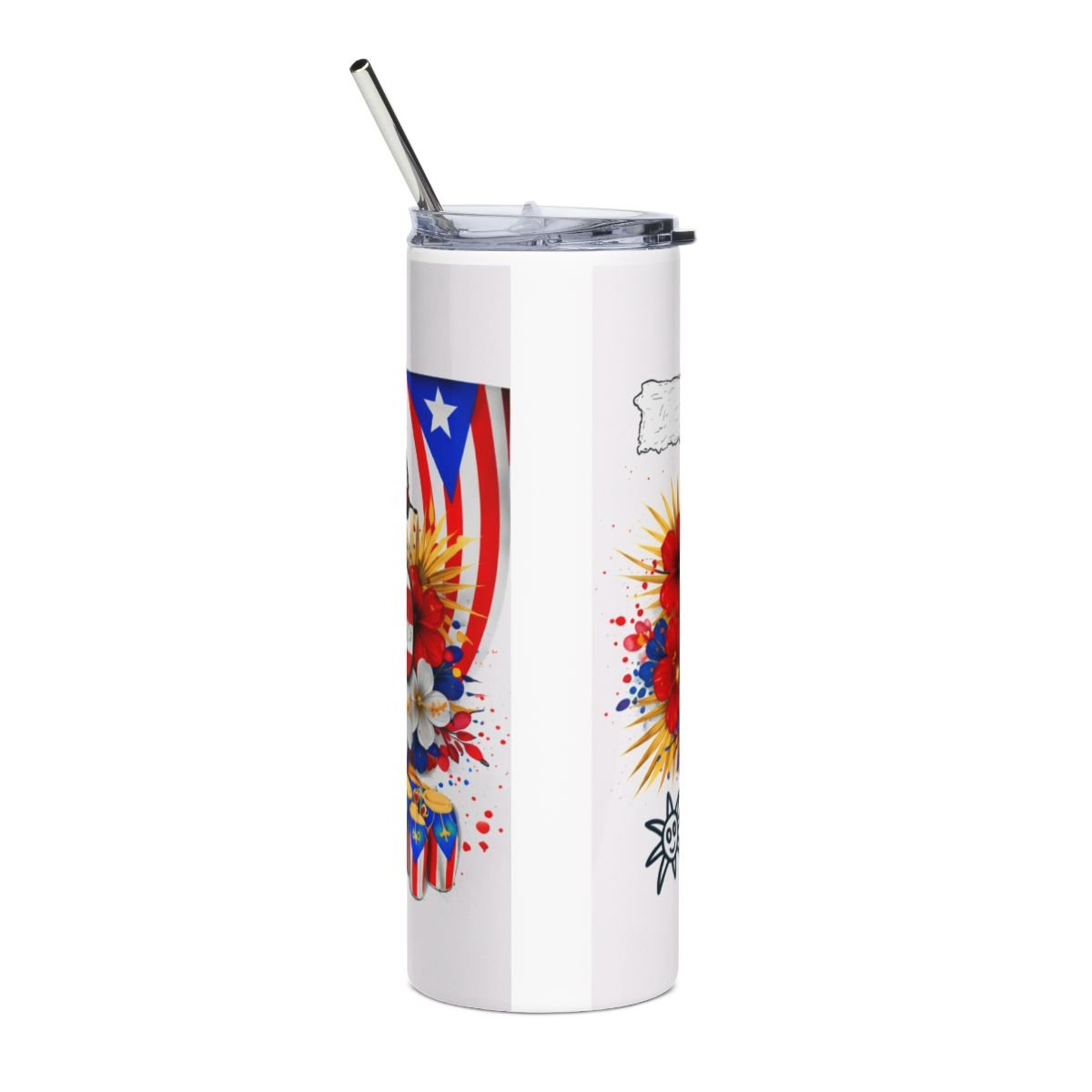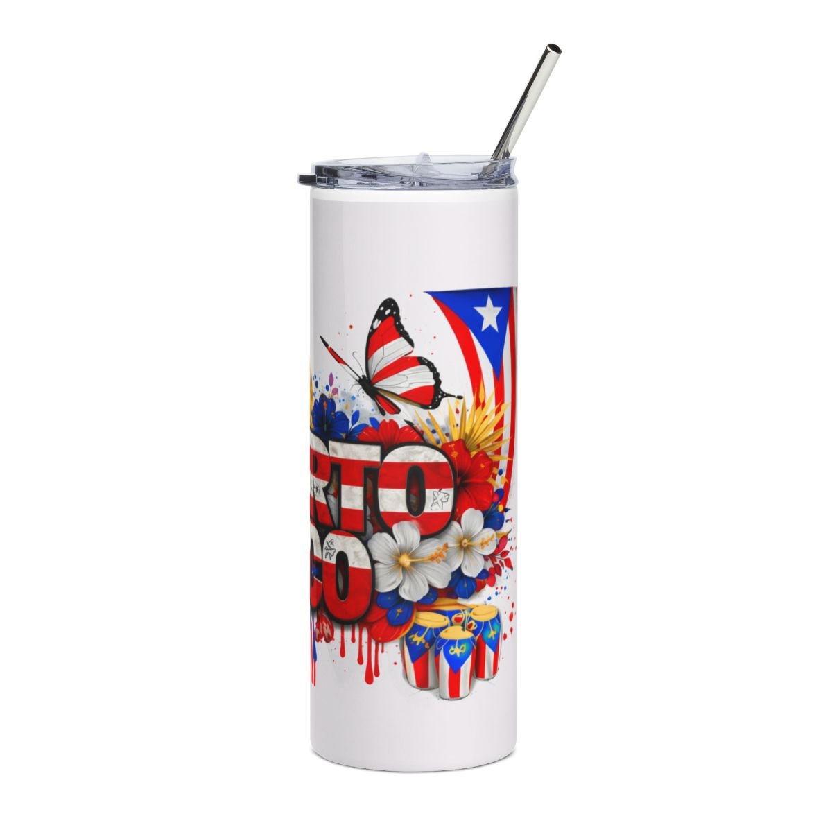 This slim 20 oz stainless steel tumbler carries the bold colors and island spirit of Puerto Rican pride. The tall, cylindrical shape keeps your drink steady while the glossy protective finish makes the vibrant floral-and-flag artwork pop. A clear lid and reusable straw let you sip on the move — from morning coffee runs to weekend festivals — while the high-grade stainless steel interior stands up to daily use. It’s a lively, wearable piece of island energy that slips into backpacks, cup holders, and hands with equal ease.