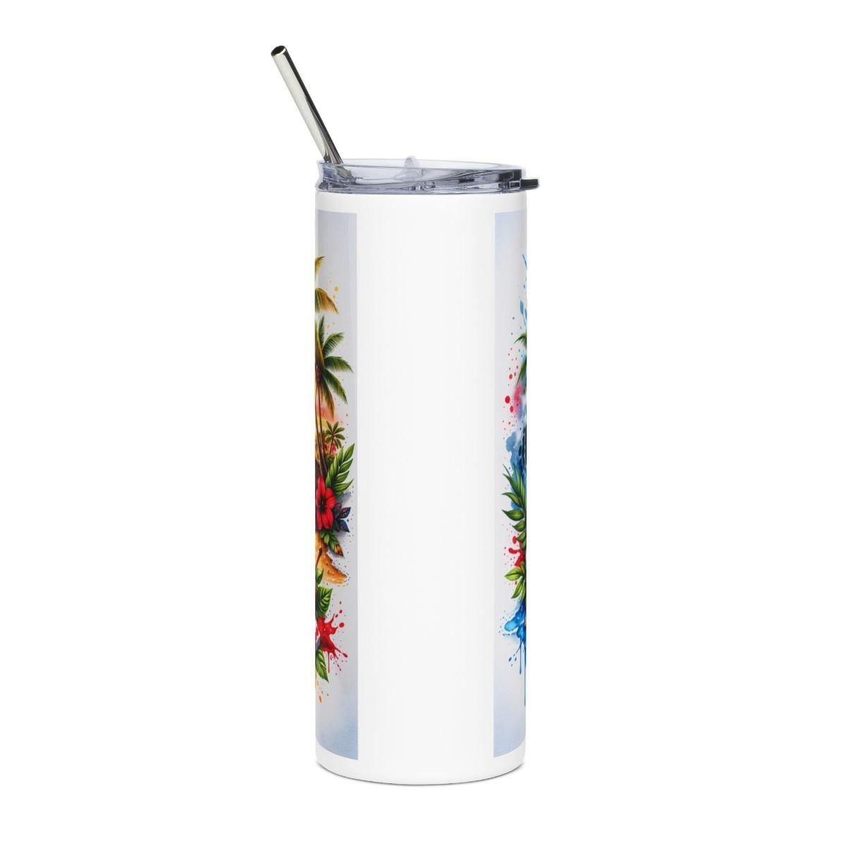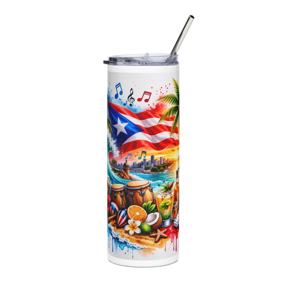 This 20 oz stainless steel tumbler brings beachside energy and island pride to every sip. The slim, cylindrical silhouette holds a full wraparound design of tropical palms, crashing surf, congas, citrus, and a bold Puerto Rican flag—an art-forward piece that feels like a mini escape. Lightweight yet sturdy, it travels from morning commutes to long drives and sunset evenings on the sand. The clear lid and metal straw keep drinks easy to enjoy while the glossy protective finish preserves the vibrant print. It sits comfortably in cup holders and feels solid in hand—made for people who carry a little island color with them wherever they go.