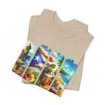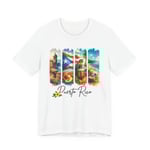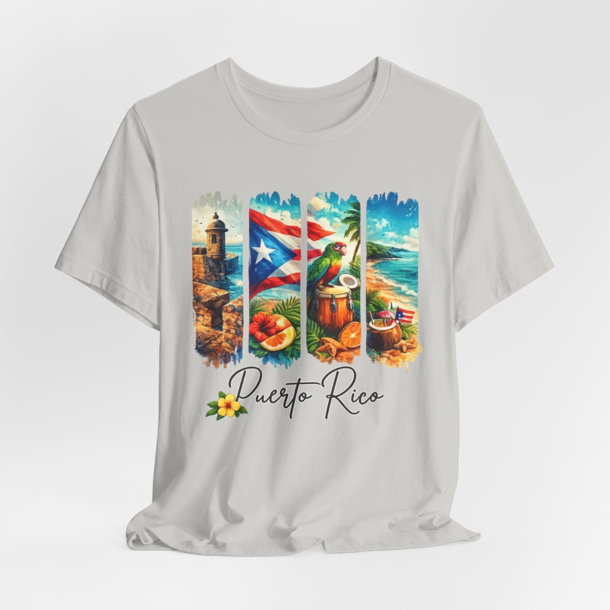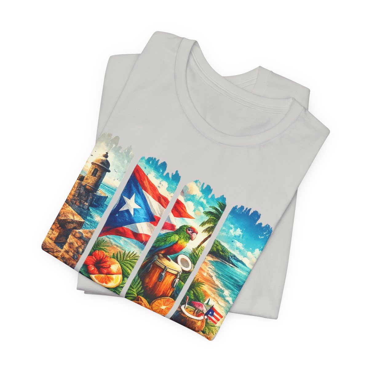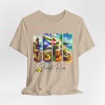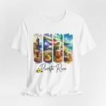 Soft, breathable, and made for everyday wear — this lightweight jersey tee brings a sunlit slice of Puerto Rico into your daily routine. The front artwork is divided into vibrant vertical panels that showcase coastal cliffs, the Puerto Rican flag, tropical fruits and a colorful coquí, all painted in warm, watercolor tones. The crew neckline and retail fit sit cleanly under a jacket or stand alone on a hot afternoon. Wear it on beach drives, island reunions, or casual city strolls to carry a quiet, nostalgic reminder of salt air, color, and rhythm with you.