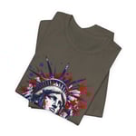 This lightweight crew-neck tee carries a bold, patriotic spirit without feeling loud. The front art centers on a stylized Statue of Liberty head rendered in painterly red, white and blue with starburst accents and subtle distressed texture. Below the image a commemorative line reads “250th Anniversary – 4th of July,” giving the shirt a vintage celebratory vibe. Breathable Airlume combed and ring-spun cotton keeps the fabric soft against skin and easy to layer under jackets or over shirts. Finished with ribbed collar, shoulder tape and side seams for lasting shape, the shirt wears comfortably through summer cookouts, parades, or quiet backyard evenings watching fireworks. Thoughtful details like a tear-away label and responsibly sourced manufacturing add everyday comfort and peace of mind.