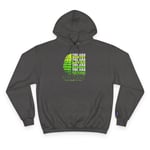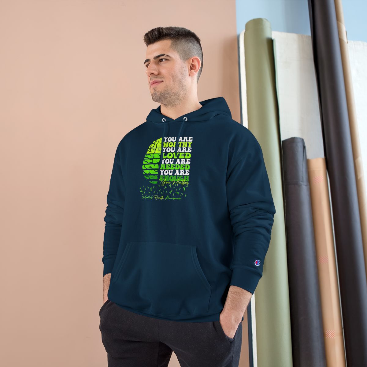 This cozy Champion hoodie carries a quiet, affirming message at its heart. The front print layers the words “YOU ARE” and “LOVED” inside a textured, green gradient shape — a small beacon of encouragement you can wear every day. The medium-heavy fabric and roomy kangaroo pocket make it an easy go-to for cool mornings, evening walks, or slow weekends. Built with Champion’s signature details (left-sleeve “C” logo and drawstring hood), it feels familiar and durable while the recycled-fibre content adds a mindful touch. Slip it on when you want comfort that speaks gently to you and to anyone who reads it.